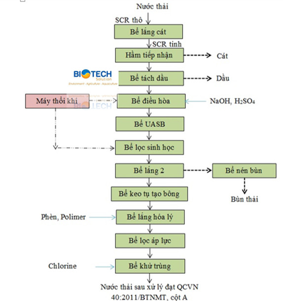 - Nước thải đầu ra đạt quy chuẩn môi trường QCVN 40/2011BTNMT cột A, xả thải vào nguồn tiếp nhận.