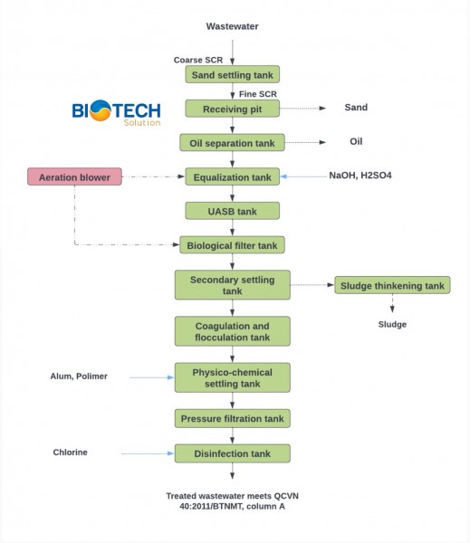 - The final wastewater meets environmental standards QCVN 40/2011BTNMT column A and is discharged into the receiving source.
